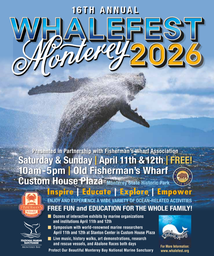 Whalefest is a 2-day event set around Monterey’s Old Fisherman’s Wharf and the adjacent Custom House Plaza, designed to be enjoyed by attendees of all ages. It features exhibits from dozens of local and national non-profit organizations related to marine science, sustainability of land and sea, and the environment. In addition, Whalefest Monterey features a Symposium where world-renowned scientists from local marine science research institutions share their latest research findings.