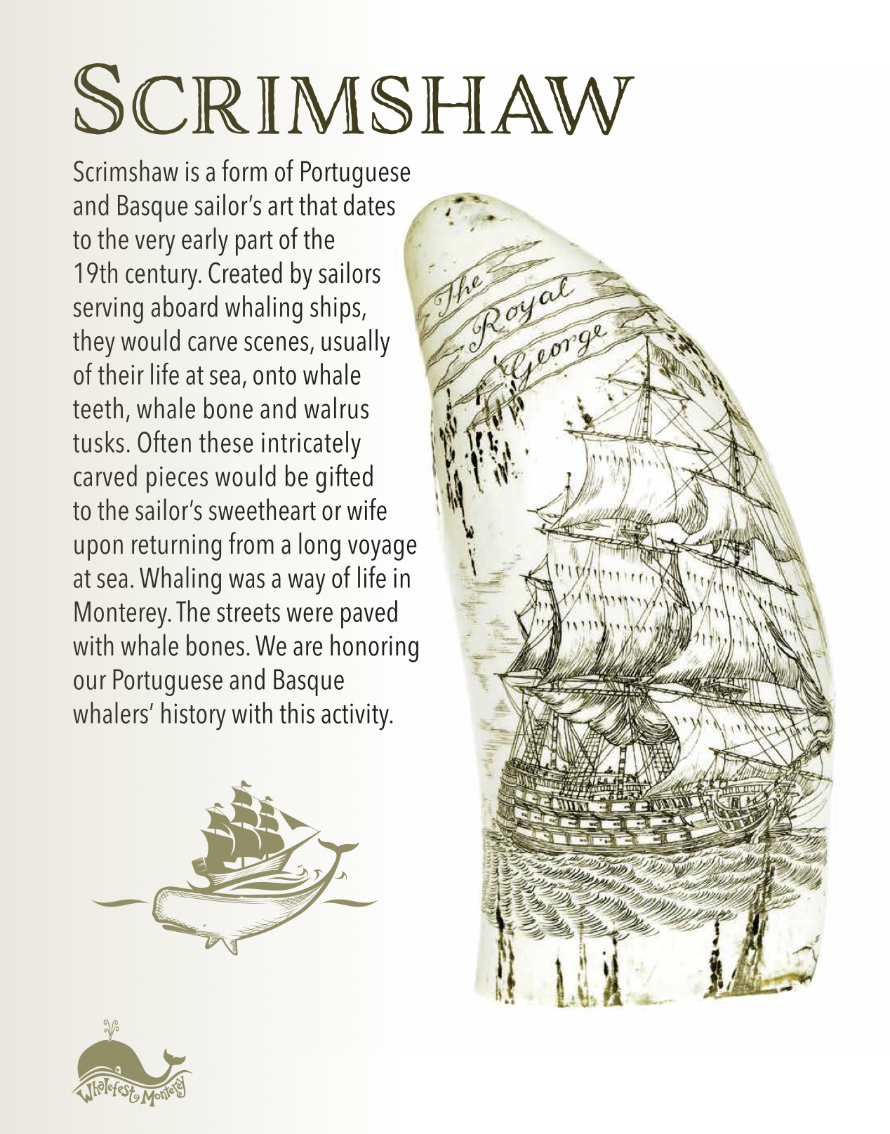 Scrimshaw is a form of Portuguese and Basque sailor’s art that dates to the very early part of the 19 th century. Created by sailors serving aboard whaling ships, they would carve scenes, usually of their life at sea, onto whale teeth, whale bone and walrus tusks. Often these intricately carved pieces would be gifted to the sailor’s sweetheart or wife upon returning from a long voyage at sea. Whaling was a way of life in Monterey. The streets were paved with whale bones. We are honoring our Portuguese and Basque whalers' history with this activity.